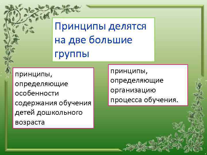 Принципы делятся на две большие группы принципы, определяющие особенности содержания обучения детей дошкольного возраста принципы, определяющие организацию процесса обучения.