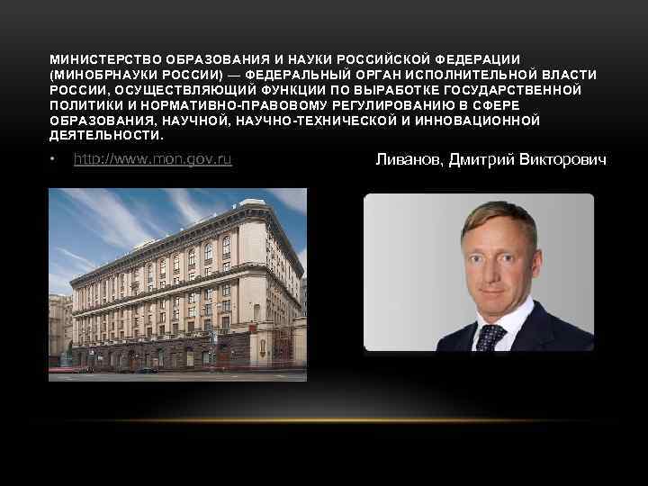 МИНИСТЕРСТВО ОБРАЗОВАНИЯ И НАУКИ РОССИЙСКОЙ ФЕДЕРАЦИИ (МИНОБРНАУКИ РОССИИ) — ФЕДЕРАЛЬНЫЙ ОРГАН ИСПОЛНИТЕЛЬНОЙ ВЛАСТИ РОССИИ, ОСУЩЕСТВЛЯЮЩИЙ ФУНКЦИИ ПО ВЫРАБОТКЕ ГОСУДАРСТВЕННОЙ ПОЛИТИКИ И НОРМАТИВНО-ПРАВОВОМУ РЕГУЛИРОВАНИЮ В СФЕРЕ ОБРАЗОВАНИЯ, НАУЧНОЙ, НАУЧНО-ТЕХНИЧЕСКОЙ И ИННОВАЦИОННОЙ ДЕЯТЕЛЬНОСТИ. • http: //www. mon. gov. ru Ливанов, Дмитрий Викторович