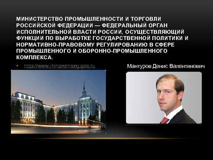 МИНИСТЕРСТВО ПРОМЫШЛЕННОСТИ И ТОРГОВЛИ РОССИЙСКОЙ ФЕДЕРАЦИИ — ФЕДЕРАЛЬНЫЙ ОРГАН ИСПОЛНИТЕЛЬНОЙ ВЛАСТИ РОССИИ, ОСУЩЕСТВЛЯЮЩИЙ ФУНКЦИИ ПО ВЫРАБОТКЕ ГОСУДАРСТВЕННОЙ ПОЛИТИКИ И НОРМАТИВНО-ПРАВОВОМУ РЕГУЛИРОВАНИЮ В СФЕРЕ ПРОМЫШЛЕННОГО И ОБОРОННО-ПРОМЫШЛЕННОГО КОМПЛЕКСА. • http: //www. minpromtorg. gov. ru Мантуров Денис Валентинович