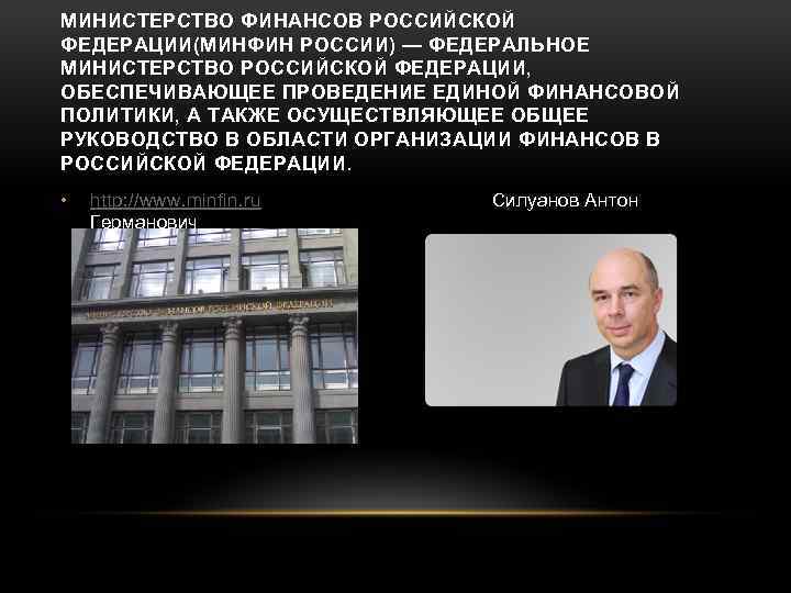 МИНИСТЕРСТВО ФИНАНСОВ РОССИЙСКОЙ ФЕДЕРАЦИИ(МИНФИН РОССИИ) — ФЕДЕРАЛЬНОЕ МИНИСТЕРСТВО РОССИЙСКОЙ ФЕДЕРАЦИИ, ОБЕСПЕЧИВАЮЩЕЕ ПРОВЕДЕНИЕ ЕДИНОЙ ФИНАНСОВОЙ ПОЛИТИКИ, А ТАКЖЕ ОСУЩЕСТВЛЯЮЩЕЕ ОБЩЕЕ РУКОВОДСТВО В ОБЛАСТИ ОРГАНИЗАЦИИ ФИНАНСОВ В РОССИЙСКОЙ ФЕДЕРАЦИИ. • http: //www. minfin. ru Германович Силуанов Антон