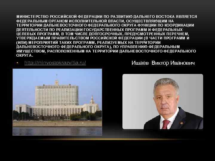 МИНИСТЕРСТВО РОССИЙСКОЙ ФЕДЕРАЦИИ ПО РАЗВИТИЮ ДАЛЬНЕГО ВОСТОКА ЯВЛЯЕТСЯ ФЕДЕРАЛЬНЫМ ОРГАНОМ ИСПОЛНИТЕЛЬНОЙ ВЛАСТИ, ОСУЩЕСТВЛЯЮЩИМ НА ТЕРРИТОРИИ ДАЛЬНЕВОСТОЧНОГО ФЕДЕРАЛЬНОГО ОКРУГА ФУНКЦИИ ПО КООРДИНАЦИИ ДЕЯТЕЛЬНОСТИ ПО РЕАЛИЗАЦИИ ГОСУДАРСТВЕННЫХ ПРОГРАММ И ФЕДЕРАЛЬНЫХ ЦЕЛЕВЫХ ПРОГРАММ, В ТОМ ЧИСЛЕ ДОЛГОСРОЧНЫХ, ПРЕДУСМОТРЕННЫХ ПЕРЕЧНЕМ, УТВЕРЖДАЕМЫМ ПРАВИТЕЛЬСТВОМ РОССИЙСКОЙ ФЕДЕРАЦИИ (В ЧАСТИ ПРОГРАММ И (ИЛИ) МЕРОПРИЯТИЙ ТАКИХ ПРОГРАММ, РЕАЛИЗУЕМЫХ НА ТЕРРИТОРИИ ДАЛЬНЕВОСТОЧНОГО ФЕДЕРАЛЬНОГО ОКРУГА), ПО УПРАВЛЕНИЮ ФЕДЕРАЛЬНЫМ ИМУЩЕСТВОМ, РАСПОЛОЖЕННЫМ НА ТЕРРИТОРИИ ДАЛЬНЕВОСТОЧНОГО ФЕДЕРАЛЬНОГО ОКРУГА. • http: //minvostokrazvitia. ru/ Ишаев Виктор Иванович