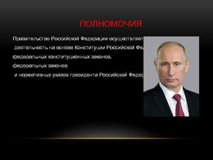 ПОЛНОМОЧИЯ Правительство Российской Федерации осуществляет свою деятельность на основе Конституции Российской Федерации, федеральных конституционных законов, федеральных законов и нормативных указов президента Российской Федерации.