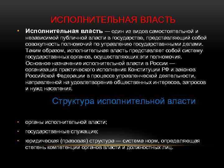 ИСПОЛНИТЕЛЬНАЯ ВЛАСТЬ • Исполнительная власть — один из видов самостоятельной и независимой публичной власти в государстве, представляющий собой совокупность полномочий по управлению государственными делами. Таким образом, исполнительная власть представляет собой систему государственных органов, осуществляющих эти полномочия. Основное назначение исполнительной власти в России — организация практического исполнения Конституции РФ и законов Российской Федерации в процессе управленческой деятельности, направленной на удовлетворение общественных интересов, запросов и нужд населения. Структура исполнительной власти • органы исполнительной власти; • государственные служащие; • юридическая (правовая) структура — система норм, определяющая степень компетенции органов власти и должностных лиц.