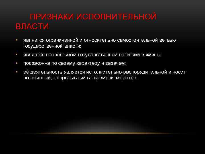 ПРИЗНАКИ ИСПОЛНИТЕЛЬНОЙ ВЛАСТИ • является ограниченной и относительно самостоятельной ветвью государственной власти; • является проводником государственной политики в жизнь; • подзаконна по своему характеру и задачам; • её деятельность является исполнительно-распорядительной и носит постоянный, непрерывный во времени характер.