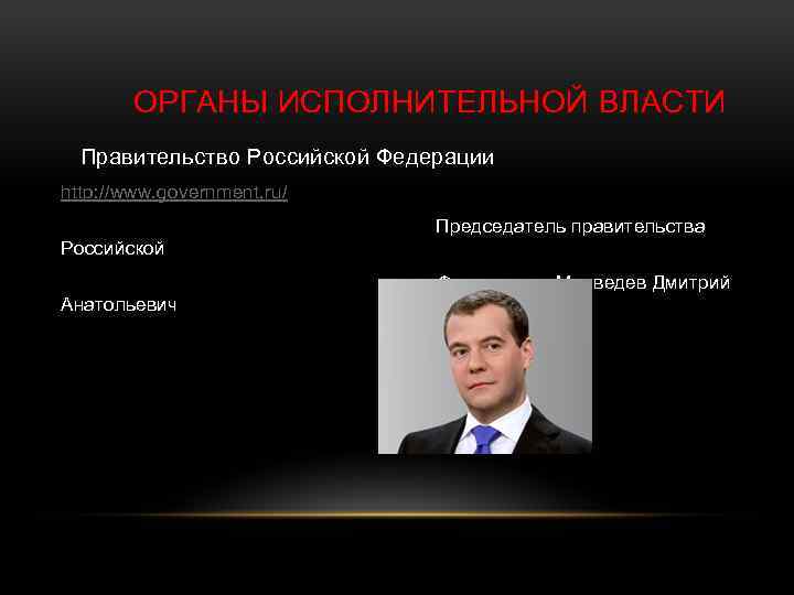 ОРГАНЫ ИСПОЛНИТЕЛЬНОЙ ВЛАСТИ Правительство Российской Федерации http: //www. government. ru/ Председатель правительства Российской Федерации : Медведев Дмитрий Анатольевич
