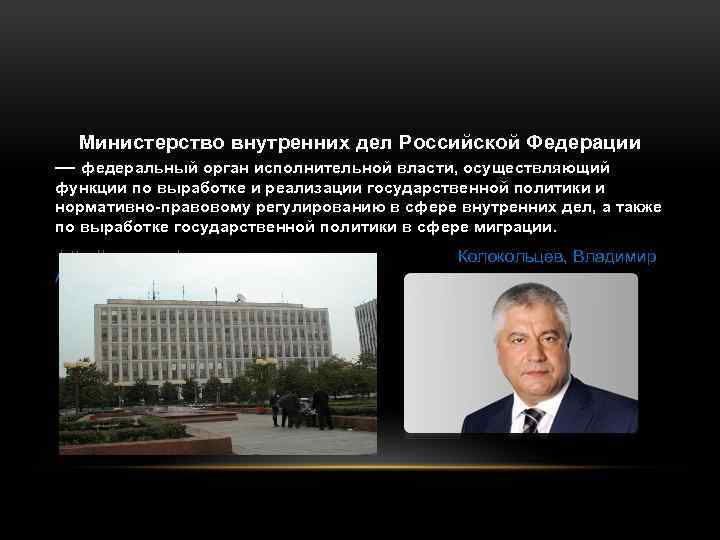 Министерство внутренних дел Российской Федерации — федеральный орган исполнительной власти, осуществляющий функции по выработке и реализации государственной политики и нормативно-правовому регулированию в сфере внутренних дел, а также по выработке государственной политики в сфере миграции. http: //www. mvd. ru Александрович Колокольцев, Владимир