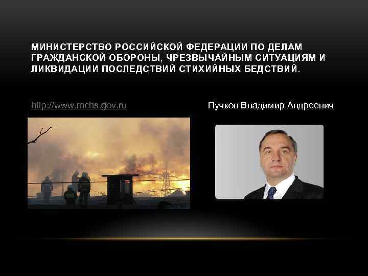 МИНИСТЕРСТВО РОССИЙСКОЙ ФЕДЕРАЦИИ ПО ДЕЛАМ ГРАЖДАНСКОЙ ОБОРОНЫ, ЧРЕЗВЫЧАЙНЫМ СИТУАЦИЯМ И ЛИКВИДАЦИИ ПОСЛЕДСТВИЙ СТИХИЙНЫХ БЕДСТВИЙ. http: //www. mchs. gov. ru Пучков Владимир Андреевич