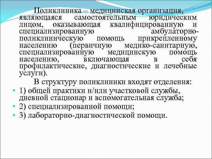 Поликлиника – медицинская организация, являющаяся самостоятельным юридическим лицом, оказывающая квалифицированную и специализированную амбулаторно- поликлиническую помощь прикрепленному населению (первичную медико-санитарную, специализированную медицинскую помощь населению, включающая в себя профилактические, диагностические и лечебные услуги). В структуру поликлиники входят отделения: • 1) общей практики и/или участковой службы, дневной стационар и вспомогательная служба; • 2) специализированной помощи; • 3) лабораторно-диагностической помощи.