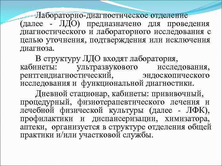 Лабораторно-диагностическое отделение (далее - ЛДО) предназначено для проведения диагностического и лабораторного исследования с целью уточнения, подтверждения или исключения диагноза. В структуру ЛДО входят лаборатория, кабинеты: ультразвукового исследования, рентгендиагностический, эндоскопического исследования и функциональной диагностики. Дневной стационар, кабинеты: прививочный, процедурный, физиотерапевтического лечения и лечебной физической культуры (далее - ЛФК), профилактики и диспансеризации, химизатора, аптеки, организуется в структуре отделения общей практики и/или участковой службы.