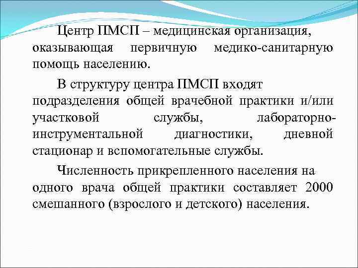 Центр ПМСП – медицинская организация, оказывающая первичную медико-санитарную помощь населению. В структуру центра ПМСП входят подразделения общей врачебной практики и/или участковой службы, лабораторно- инструментальной диагностики, дневной стационар и вспомогательные службы. Численность прикрепленного населения на одного врача общей практики составляет 2000 смешанного (взрослого и детского) населения.
