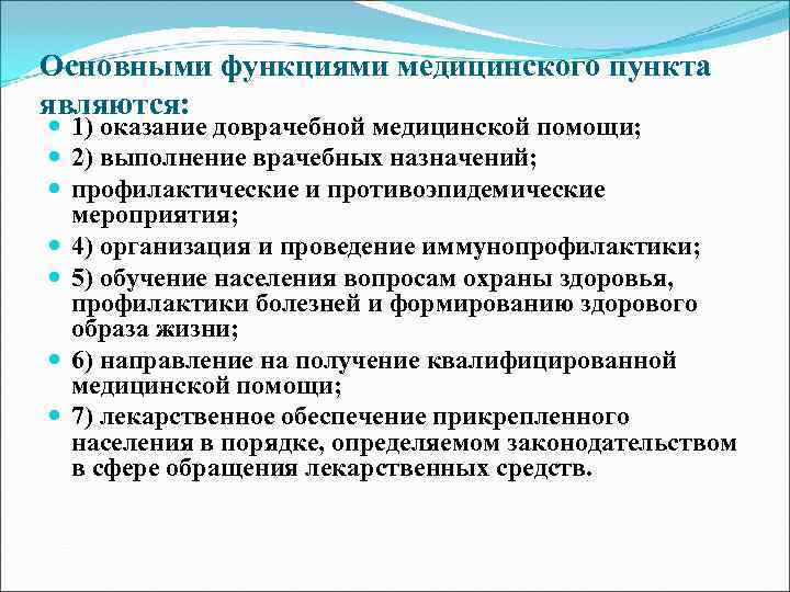 Основными функциями медицинского пункта являются: 1) оказание доврачебной медицинской помощи; 2) выполнение врачебных назначений; профилактические и противоэпидемические мероприятия; 4) организация и проведение иммунопрофилактики; 5) обучение населения вопросам охраны здоровья, профилактики болезней и формированию здорового образа жизни; 6) направление на получение квалифицированной медицинской помощи; 7) лекарственное обеспечение прикрепленного населения в порядке, определяемом законодательством в сфере обращения лекарственных средств.