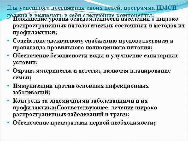 Для успешного достижения своих целей, программа ПМСП должна в включать в себя следующие компоненты: • Повышение уровня осведомленности населения о широко распространенных патологических состояниях и методах их профилактики; • Содействие адекватному снабжению продовольствием и пропаганда правильного полноценного питания; • Обеспечение безопасности воды и улучшение санитарных условии; • Охрана материнства и детства, включая планирование семьи; • Иммунизация против основных инфекционных заболеваний; • Контроль за эндемичными заболеваниями и их профилактика; Соответствующее лечение широко распространенных заболеваний и травм; • Обеспечение препаратами первой необходимости;