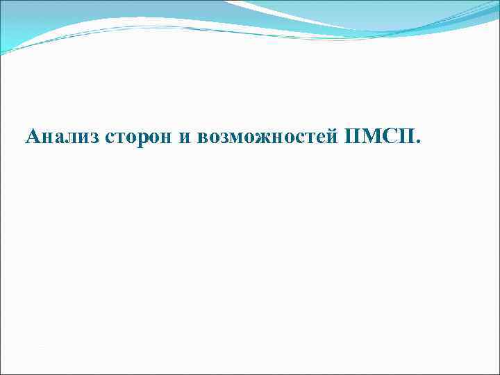 Сильные: 1. Приоритетность в Программе ПМСП. 2. Финансирование ПМСП не мене 40%, к 2010 году. 3. Подготовка и переподготовка кадров, в первую очередь ВОП и менеджеров здравоохранения. 4. Строительство, реконструкция, капремонт, материально-техническое оснащение, оснащение санитарным автотранспортом и медикаментами объектов ПМСП. 5. Стационарозамещающая технология (дневные стационары, стационары на дому). 6. Эффективная деятельность объектов ПМСП уменьшает нагрузку на деятельность стационаров и станций скорой помощи (удешевляется оказание медицинской помощи) 7. Профилактическая направленность здравоохранения, разделение ответственности за здоровье населения между государством и самими людьми, а также межсекторальный подход к решению проблем общественного здравоохранения.