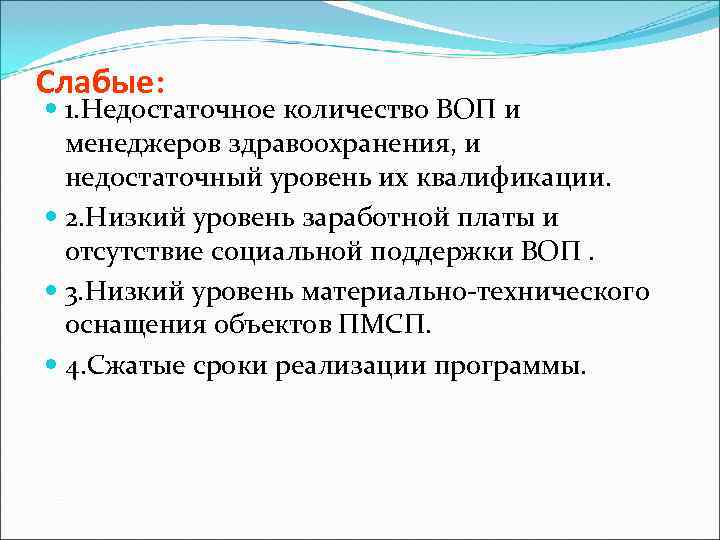 Слабые: 1. Недостаточное количество ВОП и менеджеров здравоохранения, и недостаточный уровень их квалификации. 2. Низкий уровень заработной платы и отсутствие социальной поддержки ВОП. 3. Низкий уровень материально-технического оснащения объектов ПМСП. 4. Сжатые сроки реализации программы.