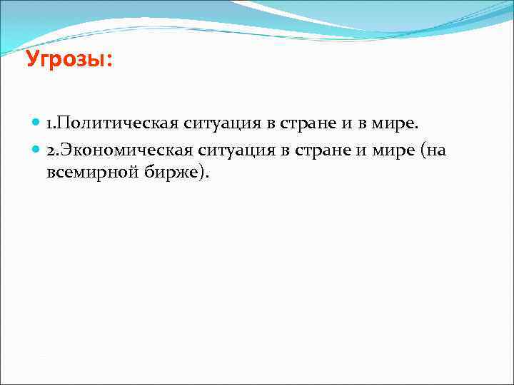 Угрозы: 1. Политическая ситуация в стране и в мире. 2. Экономическая ситуация в стране и мире (на всемирной бирже).