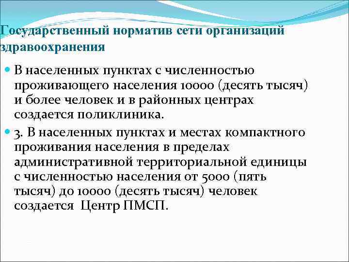 Государственный норматив сети организаций здравоохранения В населенных пунктах с численностью проживающего населения 10000 (десять тысяч) и более человек и в районных центрах создается поликлиника. 3. В населенных пунктах и местах компактного проживания населения в пределах административной территориальной единицы с численностью населения от 5000 (пять тысяч) до 10000 (десять тысяч) человек создается Центр ПМСП.
