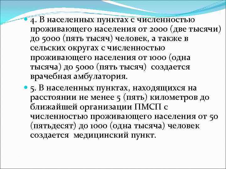 4. В населенных пунктах с численностью проживающего населения от 2000 (две тысячи) до 5000 (пять тысяч) человек, а также в сельских округах с численностью проживающего населения от 1000 (одна тысяча) до 5000 (пять тысяч) создается врачебная амбулатория. 5. В населенных пунктах, находящихся на расстоянии не менее 5 (пять) километров до ближайшей организации ПМСП с численностью проживающего населения от 50 (пятьдесят) до 1000 (одна тысяча) человек создается медицинский пункт.