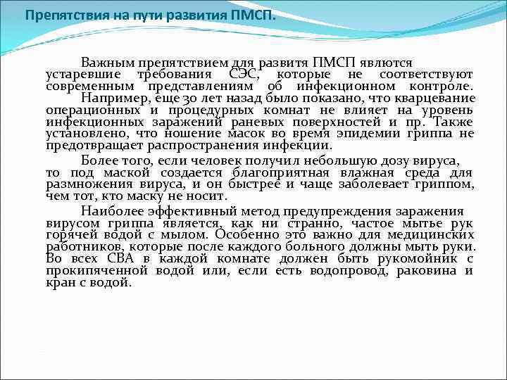 Препятствия на пути развития ПМСП. Важным препятствием для развитя ПМСП явлются устаревшие требования СЭС, которые не соответствуют современным представлениям об инфекционном контроле. Например, еще 30 лет назад было показано, что кварцевание операционных и процедурных комнат не влияет на уровень инфекционных заражений раневых поверхностей и пр. Также установлено, что ношение масок во время эпидемии гриппа не предотвращает распространения инфекции. Более того, если человек получил небольшую дозу вируса, то под маской создается благоприятная влажная среда для размножения вируса, и он быстрее и чаще заболевает гриппом, чем тот, кто маску не носит. Наиболее эффективный метод предупреждения заражения вирусом гриппа является, как ни странно, частое мытье рук горячей водой с мылом. Особенно это важно для медицинских работников, которые после каждого больного должны мыть руки. Во всех СВА в каждой комнате должен быть рукомойник с прокипяченной водой или, если есть водопровод, раковина и кран с водой.