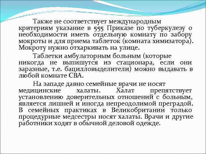 Также не соответствует международным критериям указание в 555 Приказе по туберкулезу о необходимости иметь отдельную комнату по забору мокроты и для приема таблеток (комната химизатора). Мокроту нужно отхаркивать на улице. Таблетки амбулаторным больным (которые никогда не выпишутся из стационара, если они заразные, т. е. бацилловыделители) можно выдавать в любой комнате СВА. На западе давно семейные врачи не носят медицинские халаты. Халат препятствует установлению доверительных отношений с больным, является лишней и иногда непреодолимой преградой. В семейных практиках в Великобритании только процедурные медсестры носят халаты. Врачи и другие работники ходят в обычной деловой одежде.