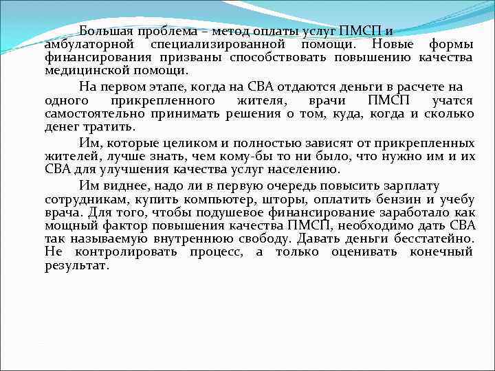 Большая проблема – метод оплаты услуг ПМСП и амбулаторной специализированной помощи. Новые формы финансирования призваны способствовать повышению качества медицинской помощи. На первом этапе, когда на СВА отдаются деньги в расчете на одного прикрепленного жителя, врачи ПМСП учатся самостоятельно принимать решения о том, куда, когда и сколько денег тратить. Им, которые целиком и полностью зависят от прикрепленных жителей, лучше знать, чем кому-бы то ни было, что нужно им и их СВА для улучшения качества услуг населению. Им виднее, надо ли в первую очередь повысить зарплату сотрудникам, купить компьютер, шторы, оплатить бензин и учебу врача. Для того, чтобы подушевое финансирование заработало как мощный фактор повышения качества ПМСП, необходимо дать СВА так называемую внутреннюю свободу. Давать деньги бесстатейно. Не контролировать процесс, а только оценивать конечный результат.