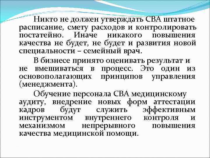 Никто не должен утверждать СВА штатное расписание, смету расходов и контролировать постатейно. Иначе никакого повышения качества не будет, не будет и развития новой специальности – семейный врач. В бизнесе принято оценивать результат и не вмешиваться в процесс. Это один из основополагающих принципов управления (менеджмента). Обучение персонала СВА медицинскому аудиту, внедрение новых форм аттестации кадров будут служить эффективным инструментом внутреннего контроля и механизмом непрерывного повышения качества медицинской помощи.