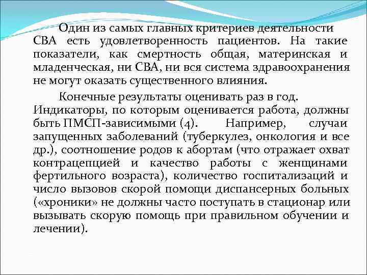 Один из самых главных критериев деятельности СВА есть удовлетворенность пациентов. На такие показатели, как смертность общая, материнская и младенческая, ни СВА, ни вся система здравоохранения не могут оказать существенного влияния. Конечные результаты оценивать раз в год. Индикаторы, по которым оценивается работа, должны быть ПМСП-зависимыми (4). Например, случаи запущенных заболеваний (туберкулез, онкология и все др. ), соотношение родов к абортам (что отражает охват контрацепцией и качество работы с женщинами фертильного возраста), количество госпитализаций и число вызовов скорой помощи диспансерных больных ( «хроники» не должны часто поступать в стационар или вызывать скорую помощь при правильном обучении и лечении).