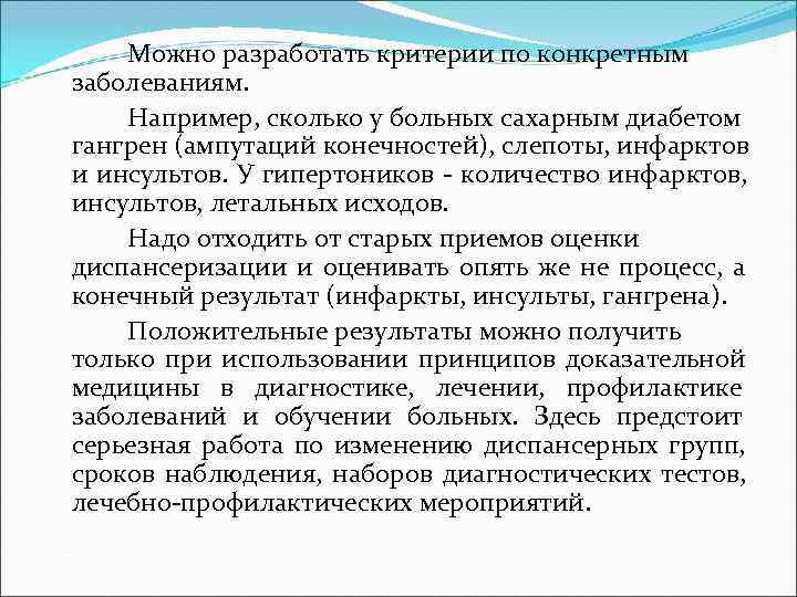 Можно разработать критерии по конкретным заболеваниям. Например, сколько у больных сахарным диабетом гангрен (ампутаций конечностей), слепоты, инфарктов и инсультов. У гипертоников - количество инфарктов, инсультов, летальных исходов. Надо отходить от старых приемов оценки диспансеризации и оценивать опять же не процесс, а конечный результат (инфаркты, инсульты, гангрена). Положительные результаты можно получить только при использовании принципов доказательной медицины в диагностике, лечении, профилактике заболеваний и обучении больных. Здесь предстоит серьезная работа по изменению диспансерных групп, сроков наблюдения, наборов диагностических тестов, лечебно-профилактических мероприятий.