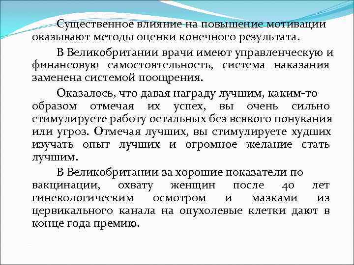 Существенное влияние на повышение мотивации оказывают методы оценки конечного результата. В Великобритании врачи имеют управленческую и финансовую самостоятельность, система наказания заменена системой поощрения. Оказалось, что давая награду лучшим, каким-то образом отмечая их успех, вы очень сильно стимулируете работу остальных без всякого понукания или угроз. Отмечая лучших, вы стимулируете худших изучать опыт лучших и огромное желание стать лучшим. В Великобритании за хорошие показатели по вакцинации, охвату женщин после 40 лет гинекологическим осмотром и мазками из цервикального канала на опухолевые клетки дают в конце года премию.