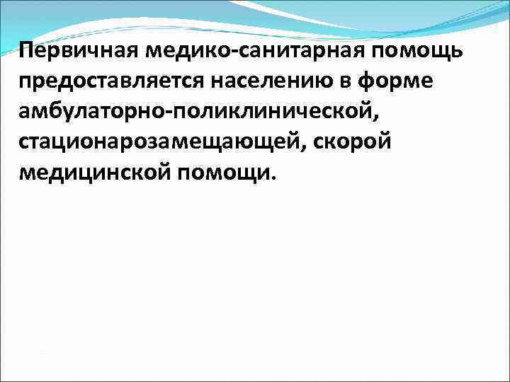 Первичная медико-санитарная помощь предоставляется населению в форме амбулаторно-поликлинической, стационарозамещающей, скорой медицинской помощи.