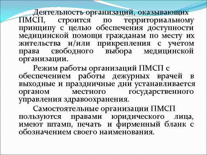 Деятельность организаций, оказывающих ПМСП, строится по территориальному принципу с целью обеспечения доступности медицинской помощи гражданам по месту их жительства и/или прикрепления с учетом права свободного выбора медицинской организации. Режим работы организаций ПМСП с обеспечением работы дежурных врачей в выходные и праздничные дни устанавливается органом местного государственного управления здравоохранения. Самостоятельные организации ПМСП пользуются правами юридического лица, имеют штамп, печать и фирменный бланк с обозначением своего наименования.
