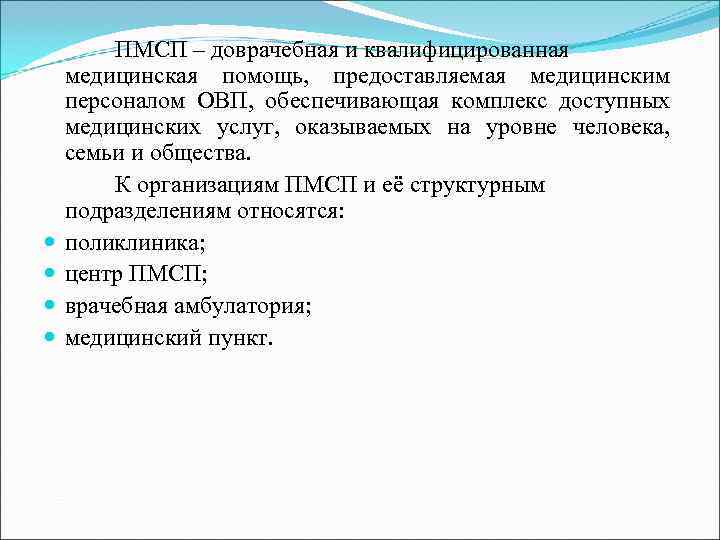 ПМСП – доврачебная и квалифицированная медицинская помощь, предоставляемая медицинским персоналом ОВП, обеспечивающая комплекс доступных медицинских услуг, оказываемых на уровне человека, семьи и общества. К организациям ПМСП и её структурным подразделениям относятся: поликлиника; центр ПМСП; врачебная амбулатория; медицинский пункт.