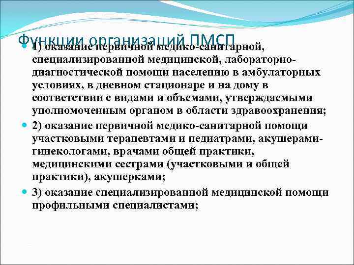 Функции организаций ПМСП 1) оказание первичной медико-санитарной, специализированной медицинской, лабораторно- диагностической помощи населению в амбулаторных условиях, в дневном стационаре и на дому в соответствии с видами и объемами, утверждаемыми уполномоченным органом в области здравоохранения; 2) оказание первичной медико-санитарной помощи участковыми терапевтами и педиатрами, акушерами- гинекологами, врачами общей практики, медицинскими сестрами (участковыми и общей практики), акушерками; 3) оказание специализированной медицинской помощи профильными специалистами;