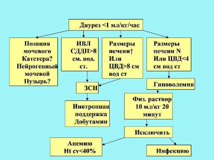 Динамика темпа диуреза в транзиторный период Возраст темп диуреза мл /кг /час Первые 36 часов >1 12 -96 часов После 2 -4 дней До 7 -8? 3 -4 До наступления периода стабилизации ренального гомеостаза темп диуреза не служит показателем адекватности поступающего в организм объема жидкости! Развитие олигурии (диурез <1 мл /кг /час) требует исключения преренальных причин: анемии, полицитемии, ЗСН, гиповолемии.