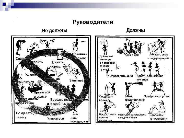 14 ПУНКТОВ ПРОГРАММЫ Э. ДЕМИНГА ДЛЯ МЕНЕДЖМЕНТА (80 -е годы ХХ века) 8. Изгоняйте страхи — поощряйте эффективные двухсторонние связи и используйте другие средства для искоренения страхов, опасений и враждебности внутри организации. 9. Разрушайте барьеры между подразделениями, службами, отделами. 10. Откажитесь от использования плакатов, лозунгов, призывов к работникам, так как подавляющее большинство проблем возникает в системе и находится вне возможностей работников. 11. Устраните произвольно установленные задания и количественные нормы — устраните рабочие инструкции и стандарты, устанавливающие производственные нормы, квоты для работников и количественные задания для руководителей. 12. Дайте работникам возможность гордиться своим трудом — устраните барьеры, которые обкрадывают рабочих и руководителей, лишая их возможности гордиться своим трудом. 13. Поощряйте стремление к образованию и совершенствованию — учредите энергичную программу образования и поддержки самосовершенствования для всех работников. 14. Необходима приверженность делу повышения качества и действенность высшего руководства — ясно определите непоколебимую приверженность высшего руководства к постоянному улучшению качества и производительности.