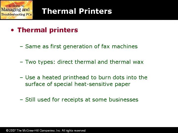 Thermal Printers • Thermal printers – Same as first generation of fax machines – Two types: direct thermal and thermal wax – Use a heated printhead to burn dots into the surface of special heat-sensitive paper – Still used for receipts at some businesses © 2007 The Mc. Graw-Hill Companies, Inc. All rights reserved