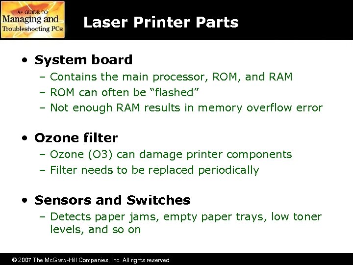 Laser Printer Parts • System board – Contains the main processor, ROM, and RAM – ROM can often be “flashed” – Not enough RAM results in memory overflow error • Ozone filter – Ozone (O 3) can damage printer components – Filter needs to be replaced periodically • Sensors and Switches – Detects paper jams, empty paper trays, low toner levels, and so on © 2007 The Mc. Graw-Hill Companies, Inc. All rights reserved