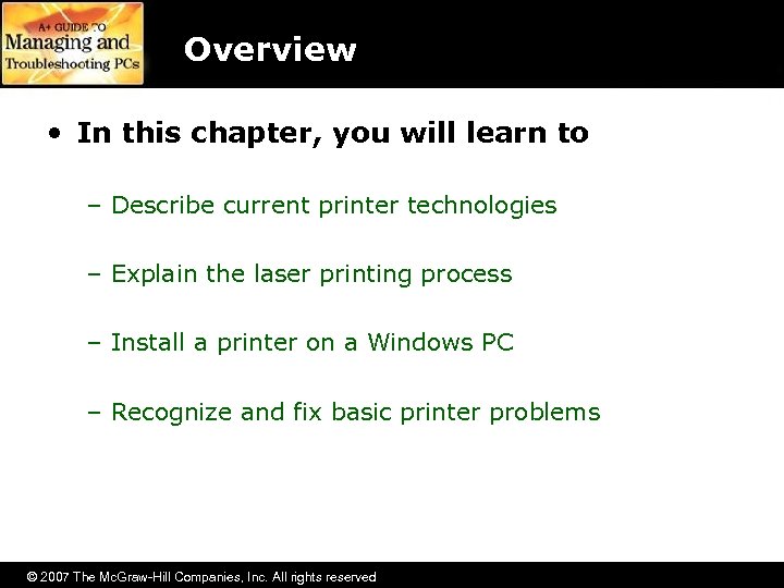 Overview • In this chapter, you will learn to – Describe current printer technologies – Explain the laser printing process – Install a printer on a Windows PC – Recognize and fix basic printer problems © 2007 The Mc. Graw-Hill Companies, Inc. All rights reserved