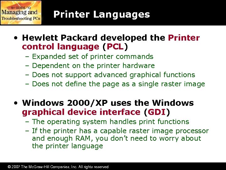 Printer Languages • Hewlett Packard developed the Printer control language (PCL) – – Expanded set of printer commands Dependent on the printer hardware Does not support advanced graphical functions Does not define the page as a single raster image • Windows 2000/XP uses the Windows graphical device interface (GDI) – The operating system handles print functions – If the printer has a capable raster image processor and enough RAM, you don’t need to worry about the printer language © 2007 The Mc. Graw-Hill Companies, Inc. All rights reserved
