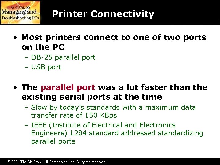 Printer Connectivity • Most printers connect to one of two ports on the PC – DB-25 parallel port – USB port • The parallel port was a lot faster than the existing serial ports at the time – Slow by today’s standards with a maximum data transfer rate of 150 KBps – IEEE (Institute of Electrical and Electronics Engineers) 1284 standard addressed standardizing parallel ports © 2007 The Mc. Graw-Hill Companies, Inc. All rights reserved