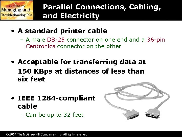 Parallel Connections, Cabling, and Electricity • A standard printer cable – A male DB-25 connector on one end a 36 -pin Centronics connector on the other • Acceptable for transferring data at 150 KBps at distances of less than six feet • IEEE 1284 -compliant cable – Can be up to 32 feet © 2007 The Mc. Graw-Hill Companies, Inc. All rights reserved