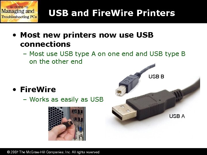 USB and Fire. Wire Printers • Most new printers now use USB connections – Most use USB type A on one end and USB type B on the other end USB B • Fire. Wire – Works as easily as USB A © 2007 The Mc. Graw-Hill Companies, Inc. All rights reserved