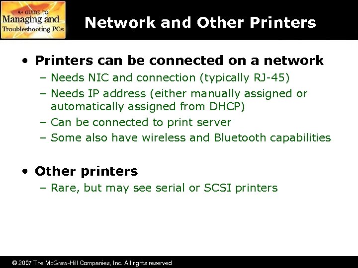 Network and Other Printers • Printers can be connected on a network – Needs NIC and connection (typically RJ-45) – Needs IP address (either manually assigned or automatically assigned from DHCP) – Can be connected to print server – Some also have wireless and Bluetooth capabilities • Other printers – Rare, but may see serial or SCSI printers © 2007 The Mc. Graw-Hill Companies, Inc. All rights reserved