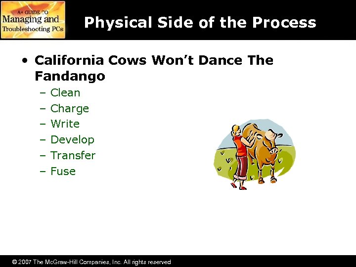 Physical Side of the Process • California Cows Won’t Dance The Fandango – – – Clean Charge Write Develop Transfer Fuse © 2007 The Mc. Graw-Hill Companies, Inc. All rights reserved