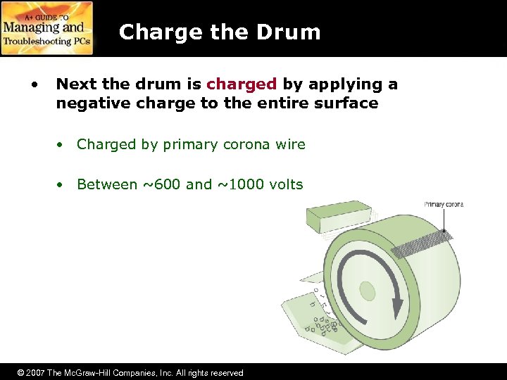 Charge the Drum • Next the drum is charged by applying a negative charge to the entire surface • Charged by primary corona wire • Between ~600 and ~1000 volts © 2007 The Mc. Graw-Hill Companies, Inc. All rights reserved