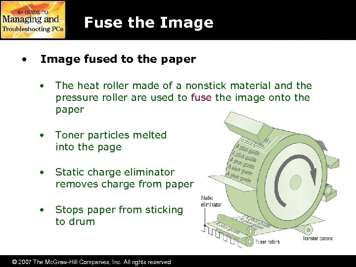Fuse the Image • Image fused to the paper • The heat roller made of a nonstick material and the pressure roller are used to fuse the image onto the paper • Toner particles melted into the page • Static charge eliminator removes charge from paper • Stops paper from sticking to drum © 2007 The Mc. Graw-Hill Companies, Inc. All rights reserved