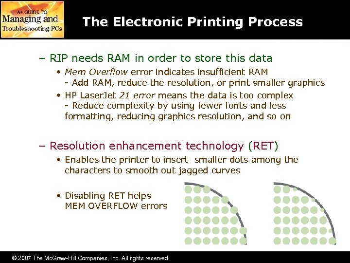 The Electronic Printing Process – RIP needs RAM in order to store this data • Mem Overflow error indicates insufficient RAM - Add RAM, reduce the resolution, or print smaller graphics • HP Laser. Jet 21 error means the data is too complex - Reduce complexity by using fewer fonts and less formatting, reducing graphics resolution, and so on – Resolution enhancement technology (RET) • Enables the printer to insert smaller dots among the characters to smooth out jagged curves • Disabling RET helps MEM OVERFLOW errors © 2007 The Mc. Graw-Hill Companies, Inc. All rights reserved