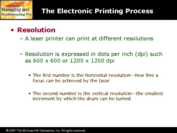 The Electronic Printing Process • Resolution – A laser printer can print at different resolutions – Resolution is expressed in dots per inch (dpi) such as 600 x 600 or 1200 x 1200 dpi • The first number is the horizontal resolution—how fine a focus can be achieved by the laser • The second number is the vertical resolution—the smallest increment by which the drum can be turned © 2007 The Mc. Graw-Hill Companies, Inc. All rights reserved