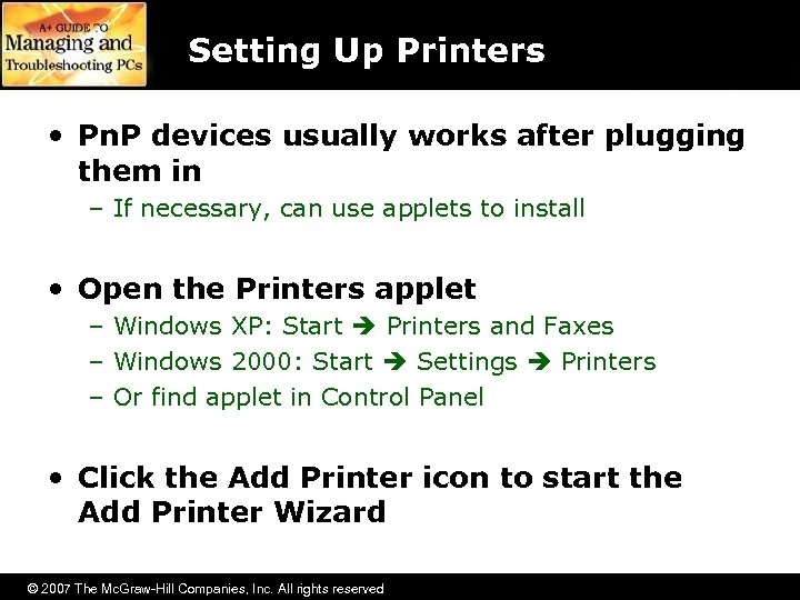Setting Up Printers • Pn. P devices usually works after plugging them in – If necessary, can use applets to install • Open the Printers applet – Windows XP: Start Printers and Faxes – Windows 2000: Start Settings Printers – Or find applet in Control Panel • Click the Add Printer icon to start the Add Printer Wizard © 2007 The Mc. Graw-Hill Companies, Inc. All rights reserved