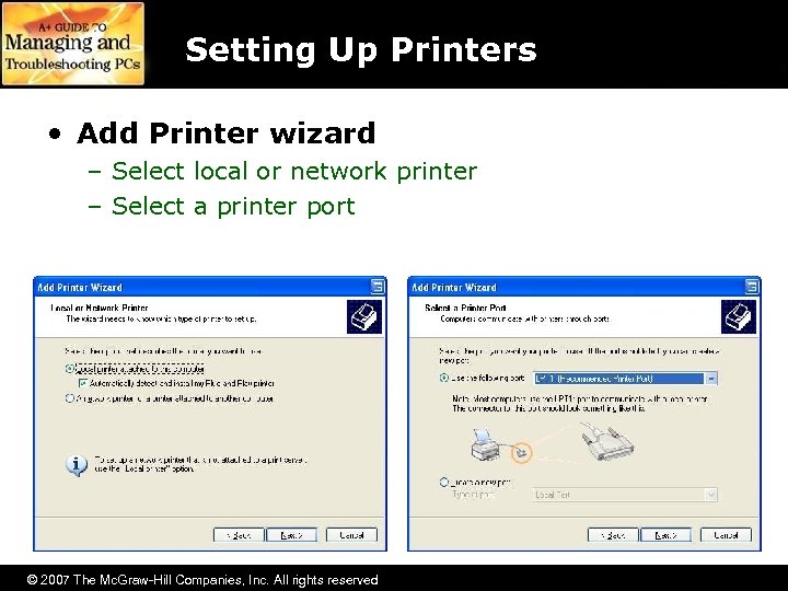Setting Up Printers • Add Printer wizard – Select local or network printer – Select a printer port © 2007 The Mc. Graw-Hill Companies, Inc. All rights reserved
