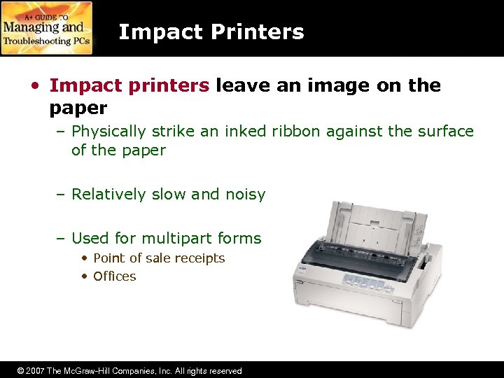 Impact Printers • Impact printers leave an image on the paper – Physically strike an inked ribbon against the surface of the paper – Relatively slow and noisy – Used for multipart forms • Point of sale receipts • Offices © 2007 The Mc. Graw-Hill Companies, Inc. All rights reserved